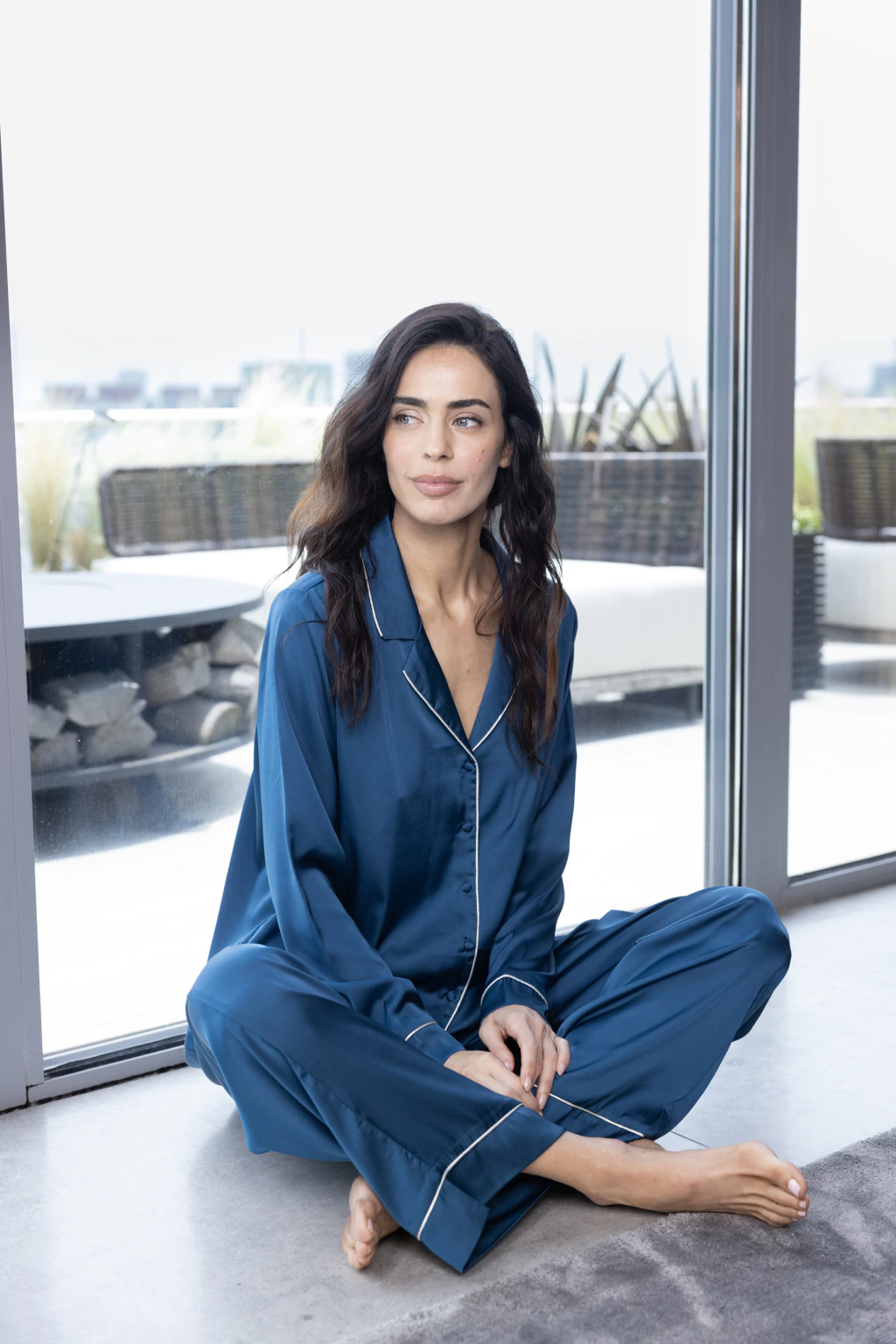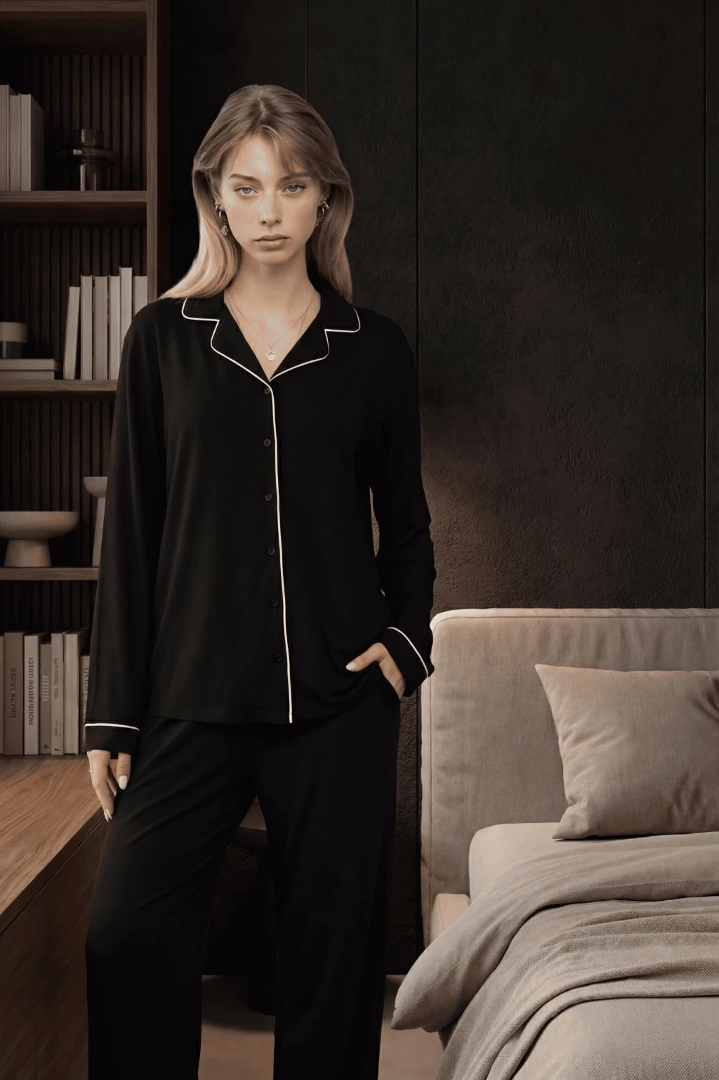 Pijama manga larga abotonado de raso suave con vivos que realzan el diseño.
